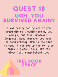 I was really hoping all of you would die so I could take my pay and go, but like, whatever. Congrats. Read whatever you want, or read nothing. Now ist he time to camp. Chris set up the tents so enjoy I guess. Looks like the elves left a map behind too.